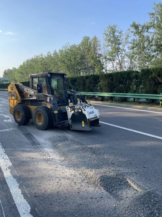 徐工滑移裝載機搭配銑刨器高速公路坑槽病害快速銑刨,預(yù)留臺階,便于分層壓實和提升路基結(jié)構(gòu)穩(wěn)定。