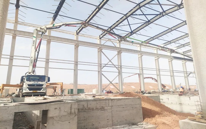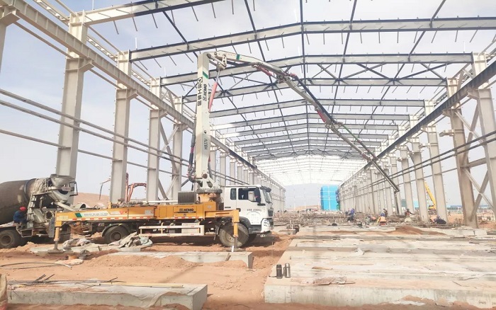 項(xiàng)目中后期以地面作業(yè)為主,鋼結(jié)構(gòu)廠房受限于空間操作,對設(shè)備的動力和靈活提出了較高要求。最小起臂高度僅7.8米的徐工HB37V,靈活的通過性和操控性讓施工作業(yè)提質(zhì)增速,為項(xiàng)目施工破解難題。