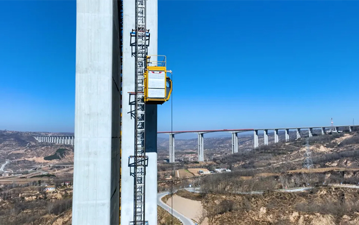 除了群塔助力,馬蓮河特大橋項目還使用了六臺徐工SC200/200FS1施工升降機,零停機、零故障,整機性能優(yōu)越,應用新型高可靠傳動機構及高能效齒輪減速電機,實現(xiàn)平穩(wěn)運行,保障鋼筋、水泥等建筑材料運輸安全,提高施工效率。