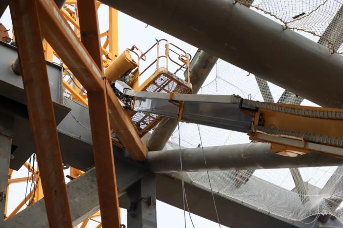此次施工的主力產(chǎn)品為徐工的XGS22K 、XGS28K、XGS40K三款車型,這三款車型作業(yè)幅度分別是17.2米、22米和24.9米,再加上帶有一節(jié)小飛臂的設(shè)計,使得其跨障能力強,更適宜現(xiàn)場這種復(fù)雜且密集的鋼結(jié)構(gòu)作業(yè)。160°的平臺回轉(zhuǎn)角度,也賦予了它更加靈活的使用方法。