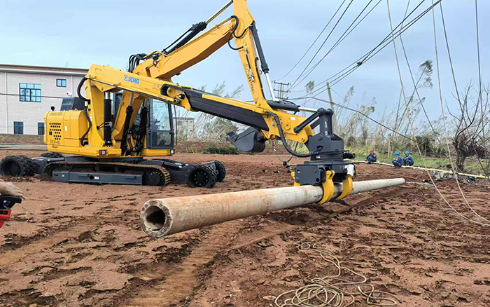徐工開挖立桿一體機產(chǎn)品一車多能,平均每次新立電桿作業(yè)僅耗時20分鐘,是砼桿組立施工作業(yè)的革新式產(chǎn)品。相較傳統(tǒng)作業(yè)人力、吊機與挖機配合的方式,更具通用性、高效率和安全性,為本次臺風搶險救援行動節(jié)省了大量的人力和時間成本,獲得施工方的高度認可。