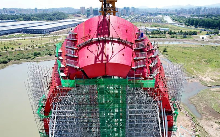 隨著重達(dá)40噸的主橋鋼塔柱最后一個(gè)節(jié)段
