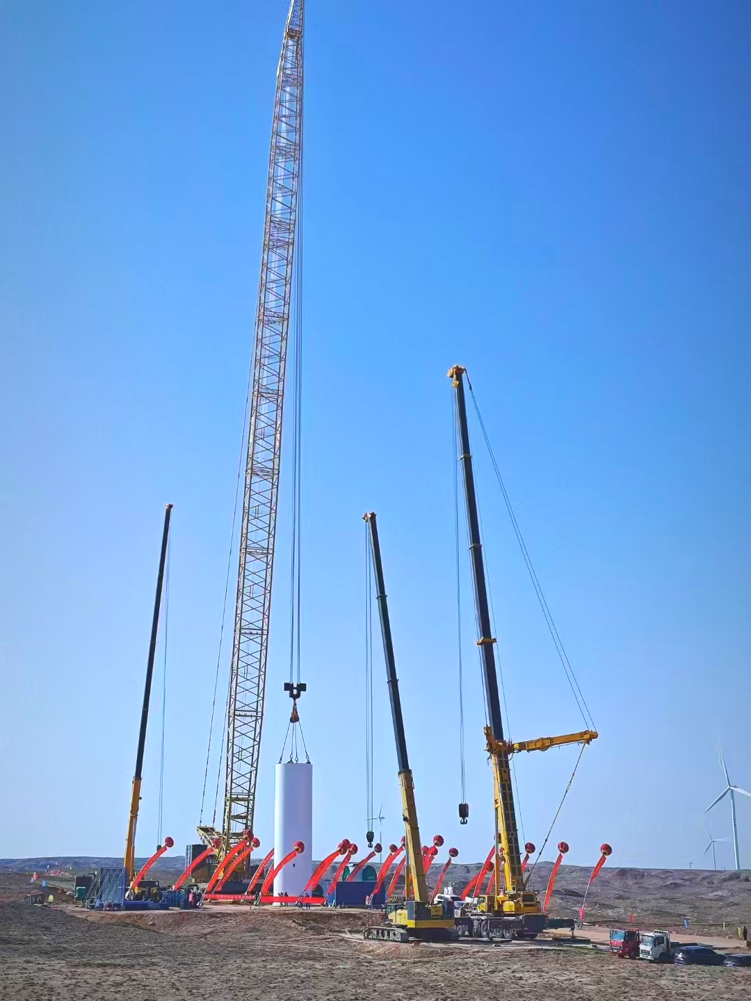 隨著施工號角吹響,各臺起重機緊密配合,XLC18000M采用138+8m的標準風電工況,穩(wěn)穩(wěn)將98m長的葉片與112t重的輪轂、葉片在百米高空精確連接到機艙,XGTC160-I、XCA600L8 和 XCA200L8_2則靈活調(diào)整位置,輔助完成關(guān)鍵部件的吊裝,整個吊裝過程精確無誤。