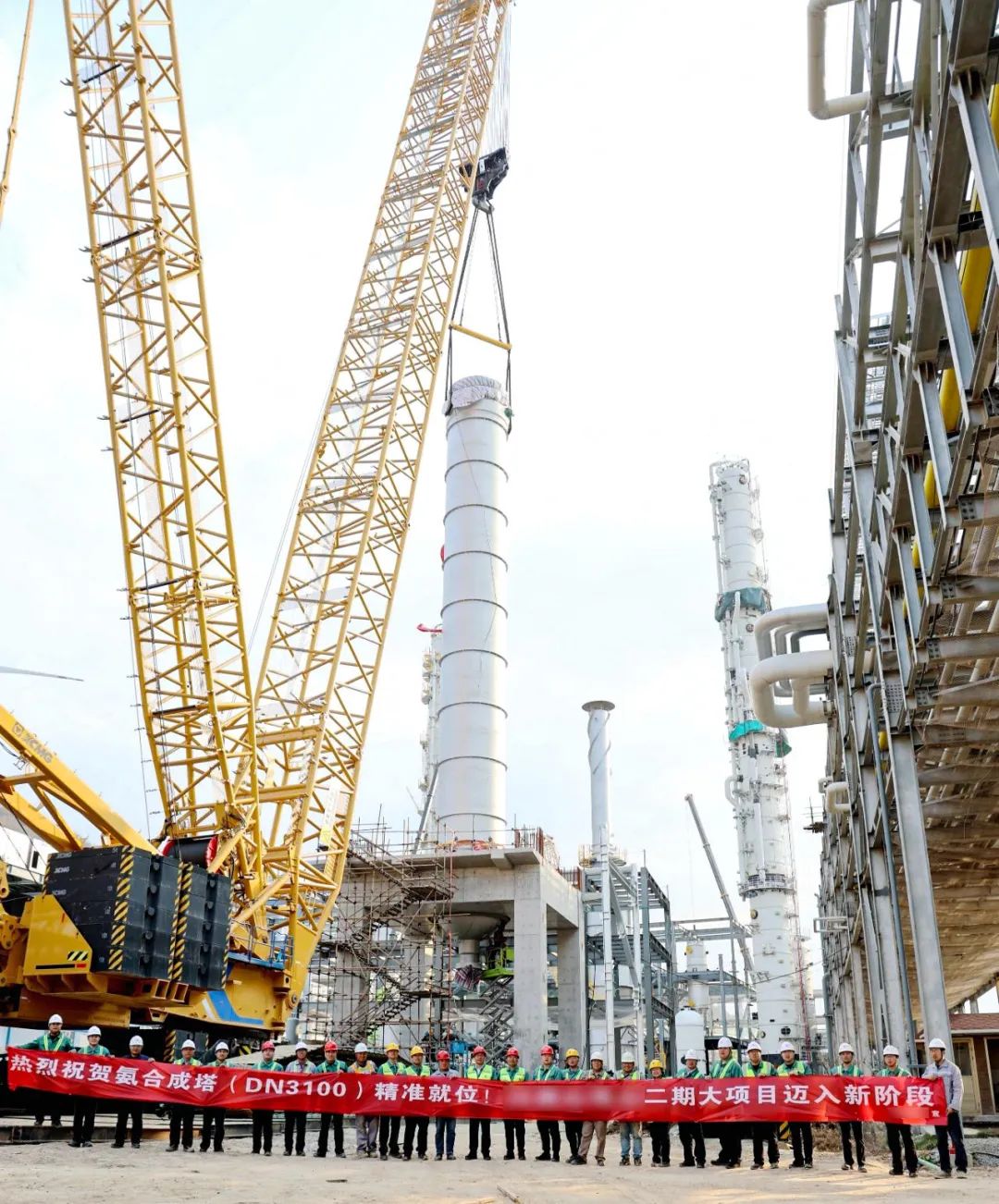 吊裝現(xiàn)場,XLC17000以超起工況展現(xiàn)出卓越的穩(wěn)定性與精準(zhǔn)性。起重臂穩(wěn)健揚起,700噸的氨合成塔在智能控制系統(tǒng)的引導(dǎo)下平穩(wěn)升空。