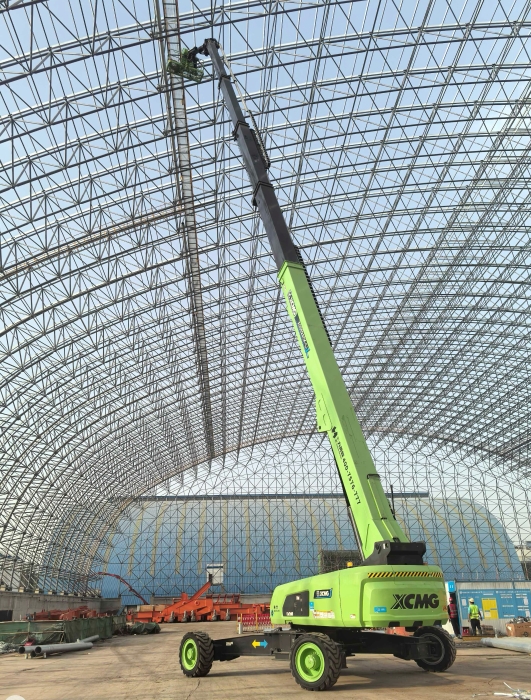 據悉,該項目需建設50米級廠房,且工地對燃料要求嚴格,傳統設備因高度不足、燃油限制難以滿足嚴苛施工要求,徐工XGS52ACK-Li憑借52米的最大作業(yè)高度、25m最大作業(yè)幅度及300/460kg雙載荷能力,完美承接廠房頂棚消防系統與管道安裝任務,全程零排放、零燃油消耗,契合電廠環(huán)保施工標準。