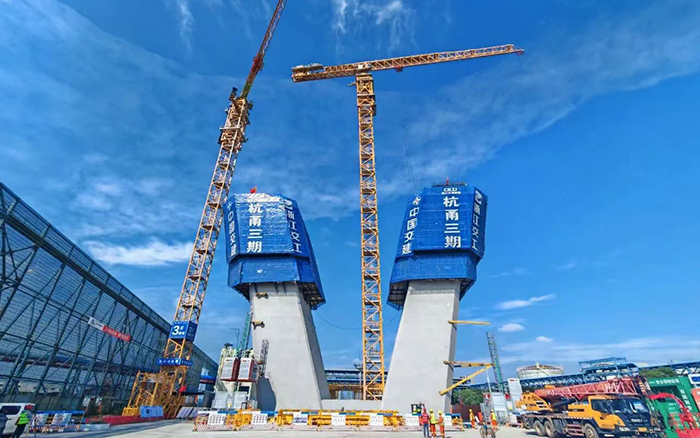 在杭甬復(fù)線寧波三期甬江特大橋施工現(xiàn)場,1臺徐工XGT3000-120S、2臺XGT3000-100S如鋼鐵巨人伸展手臂,正加緊進行著鋼筋部品的吊裝,助力3座大橋主塔以平均每天1米的速度向云端挺進,贏得施工方“技術(shù)先進、安全可靠、吊裝能力強、操作平穩(wěn)、智能化水平高、施工效益顯著”的高度肯定。