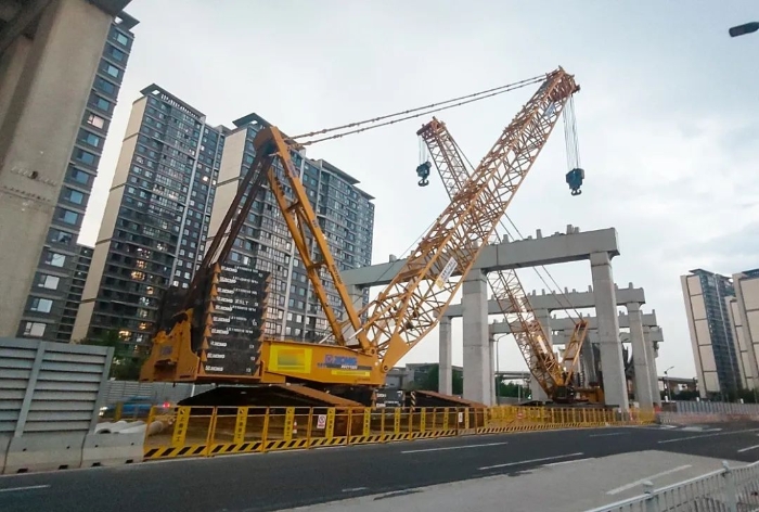 面對(duì)有限的操作空間,兩臺(tái)徐工XGC11000(650噸級(jí))履帶起重機(jī)采用42米標(biāo)準(zhǔn)主臂工況,分別精準(zhǔn)定位在梁體兩側(cè)狹窄區(qū)域內(nèi),將重達(dá)60噸的預(yù)制混凝土預(yù)制梁,穩(wěn)穩(wěn)吊離運(yùn)梁車,梁體全程保持水平“懸浮”。