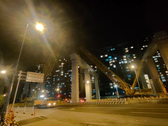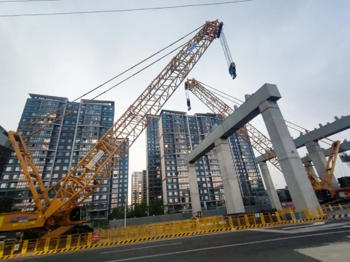 狹窄空間內(nèi),兩機(jī)協(xié)同微調(diào),在進(jìn)行精確轉(zhuǎn)場(chǎng)移動(dòng)的同時(shí),也避免了任何晃動(dòng)或扭轉(zhuǎn),重物分毫不差地平穩(wěn)落位至預(yù)定橋墩支座上,整個(gè)過程高效流暢,一氣呵成。