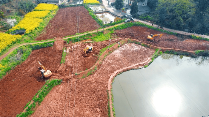 繼續(xù)向東,這里是萬(wàn)里長(zhǎng)江第一城——宜賓,在宜賓江安縣陽(yáng)春鎮(zhèn),5000畝高標(biāo)準(zhǔn)農(nóng)田建設(shè)進(jìn)入尾聲,項(xiàng)目高峰期投入30余臺(tái)徐工挖掘機(jī)。