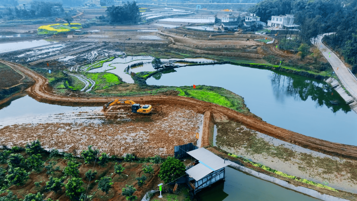 洪雅向東90公里,是仁壽縣,作為四川省產(chǎn)糧大縣,仁壽曾因田塊細(xì)碎導(dǎo)致機(jī)械化率不足。在5000畝的高標(biāo)準(zhǔn)農(nóng)田建設(shè)中,項(xiàng)目方集結(jié)18臺(tái)徐工挖掘機(jī),以“日均30多畝”的速度搶抓工期。