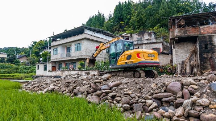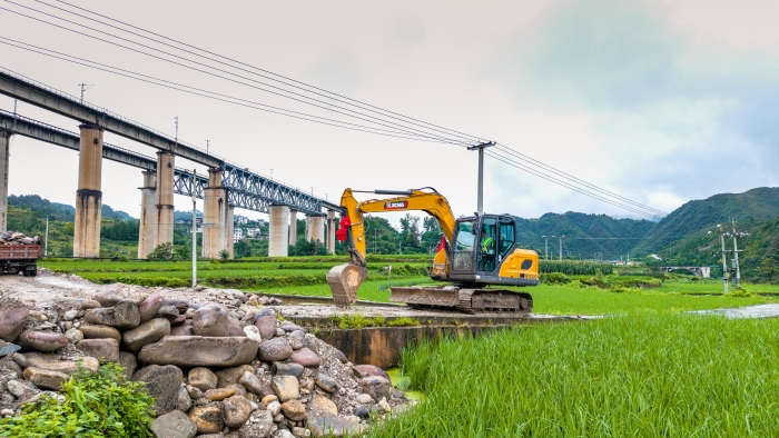 雨季施工,場(chǎng)地濕滑狹窄,對(duì)設(shè)備靈活性、可靠性和機(jī)手技術(shù)都是嚴(yán)峻的考驗(yàn)。在這片泥濘的稻田邊、陡峭的坡地上,身披“徐工金”的XE75GA挖掘機(jī),正化身開路先鋒,為苗鄉(xiāng)新居夯下第一塊基石。
