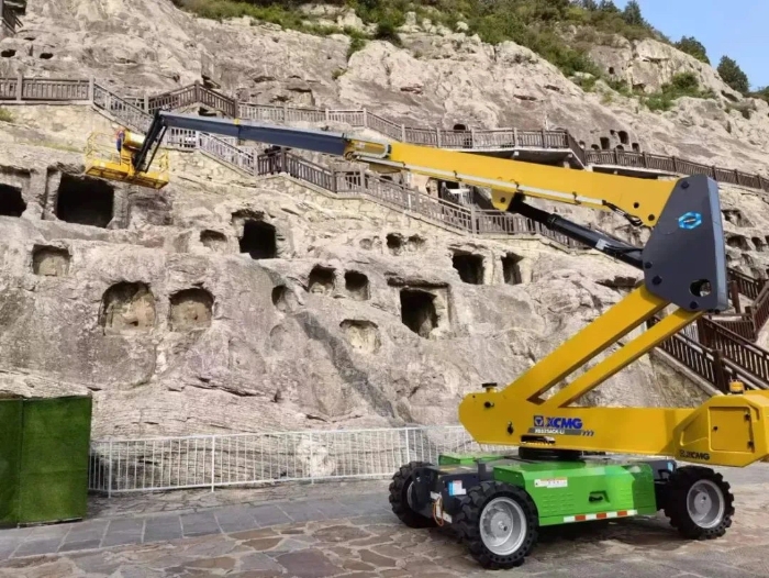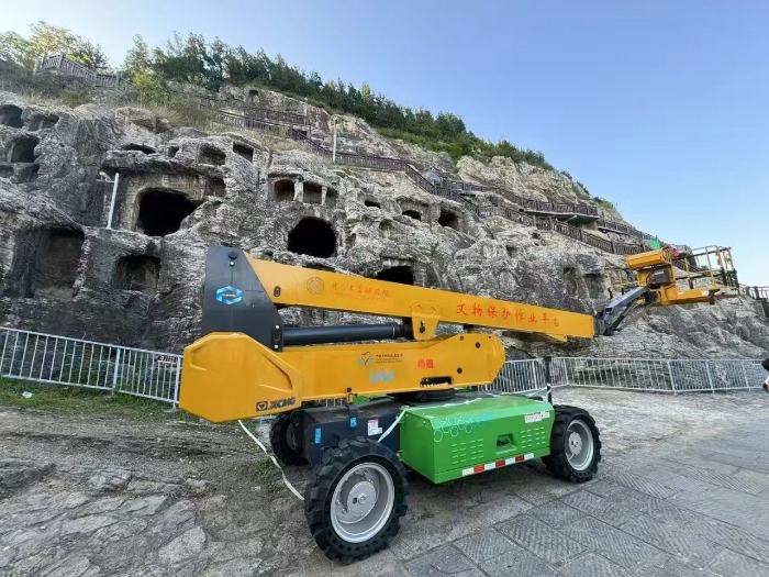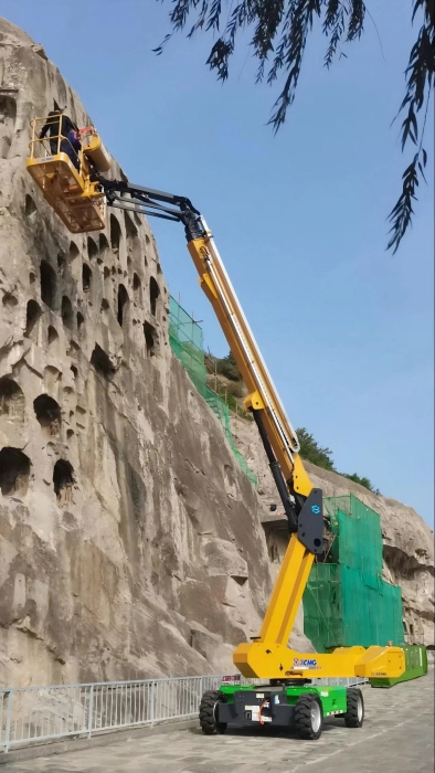 時(shí)間回溯到2021年,由于遭受多場(chǎng)暴雨侵襲,龍門石窟部分洞窟內(nèi)滲漏水嚴(yán)重甚至出現(xiàn)積水,部分山體表面巖石脫落、松動(dòng),嚴(yán)重威脅文物安全,急需得到有效治理。龍門石窟研究院隨即開展了為期1年多的“龍門石窟蓮花洞至石牛溪區(qū)域保養(yǎng)維護(hù)項(xiàng)目”。徐工XGS25ACK-Li直臂式高空作業(yè)平臺(tái)作為“得力助手”,深度參與各項(xiàng)保護(hù)修復(fù)工作。