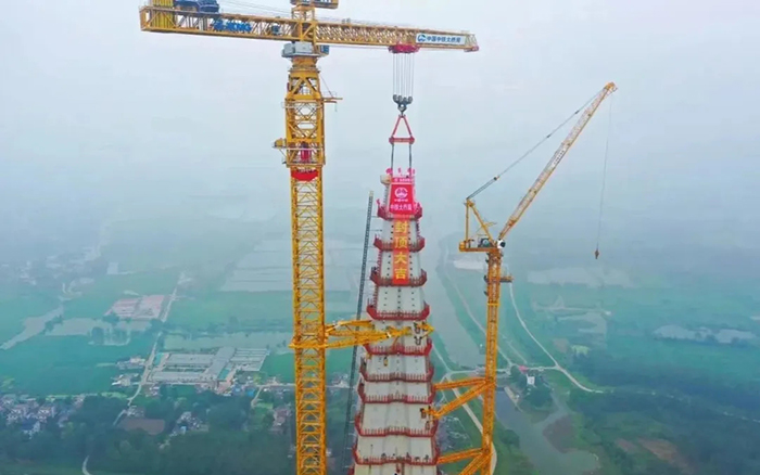 本次封頂?shù)?號墩主塔為大橋中塔柱,塔高345.6米,是全橋最高主塔,采用分塊大節(jié)段整體吊裝,共分39個吊裝節(jié)段,單節(jié)鋼塔最大重量為482.7噸。