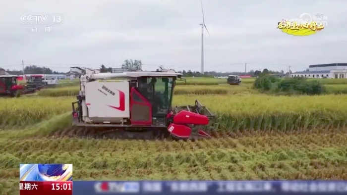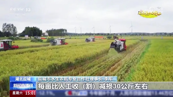 9月20日,中央電視臺(tái)新聞?lì)l道《新聞直播間》“在希望的田野上”欄目將鏡頭對(duì)準(zhǔn)湖北應(yīng)城,報(bào)道了八臺(tái)徐工XR720履帶式谷物聯(lián)合收獲機(jī)在當(dāng)?shù)亻_(kāi)展大規(guī)模糯稻收割的豐收盛景——履帶滾滾,金黃的稻穗迅速被吞入機(jī)器,頃刻間完成收割、脫粒、清選等一系列作業(yè),顆顆飽滿(mǎn)的籽粒穩(wěn)穩(wěn)落入糧倉(cāng)。