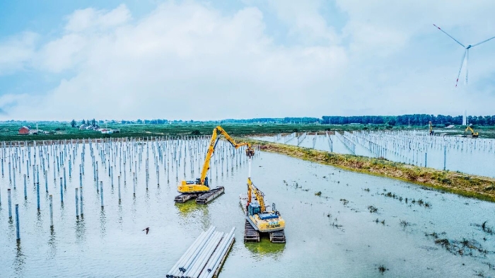 在漁業(yè)較為發(fā)達(dá)的濱海港鎮(zhèn),“漁光互補(bǔ)”光伏發(fā)電項(xiàng)目建設(shè)正如火如荼,項(xiàng)目現(xiàn)場,徐工水上打樁機(jī)的身影隨處可見。