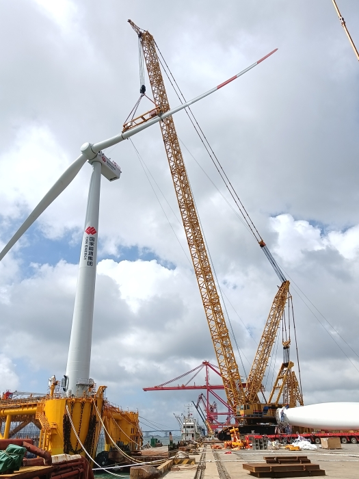 福建某海域,徐工XGC28000履帶起重機(jī)助力全球首個(gè)漂浮式風(fēng)漁融合項(xiàng)目“國(guó)能共享號(hào)”。采用126米超起主臂,先后完成226噸與102噸兩節(jié)塔筒拼接,并在42米作業(yè)半徑下完成193噸機(jī)艙吊裝,最終實(shí)現(xiàn)百米高空葉片與輪轂精準(zhǔn)對(duì)接,開(kāi)創(chuàng)“水上發(fā)電、水下養(yǎng)殖”全新模式。