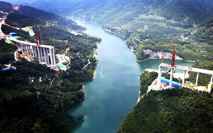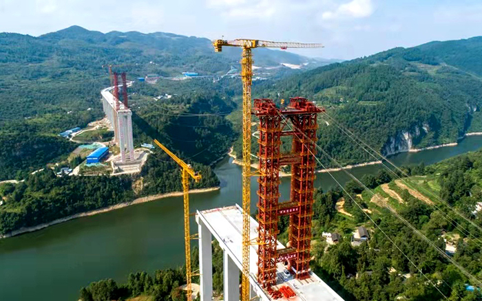 一橋虹拱烏江,天塹將變通途。在貴州德余高速烏江特大橋項目工地,多臺“徐工金”聳立江上,協(xié)助施工人員安裝吊裝纜塔。遠遠望去,數(shù)根鋼索并行跨越江水,連接兩岸,仿佛“五線譜”正在奏響壯麗的虹橋樂章。